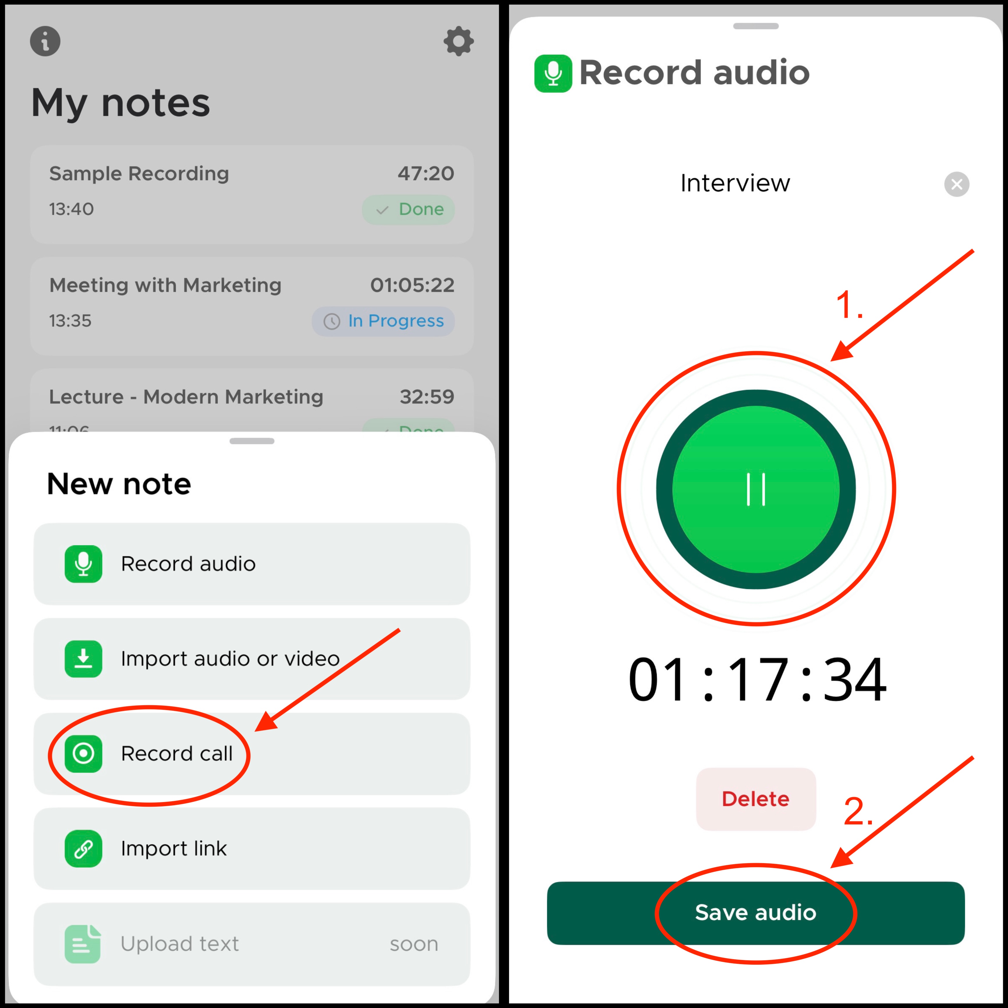 Transcriber includes a call recording feature that allows you to capture incoming and outgoing phone calls securely. All call recordings are encrypted and stored privately in the app.