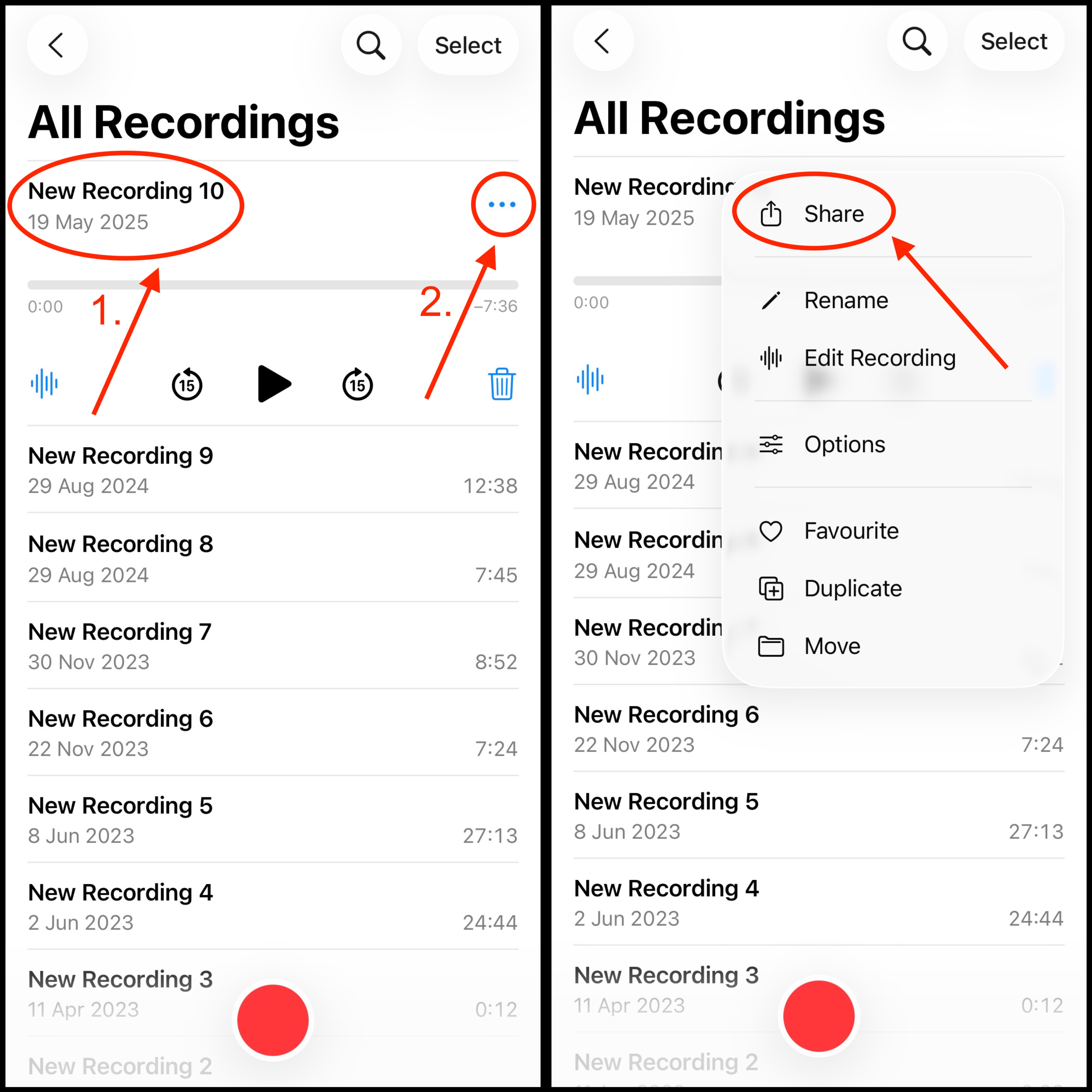 To export the recording, tap on the specific note and tap on the Export icon.