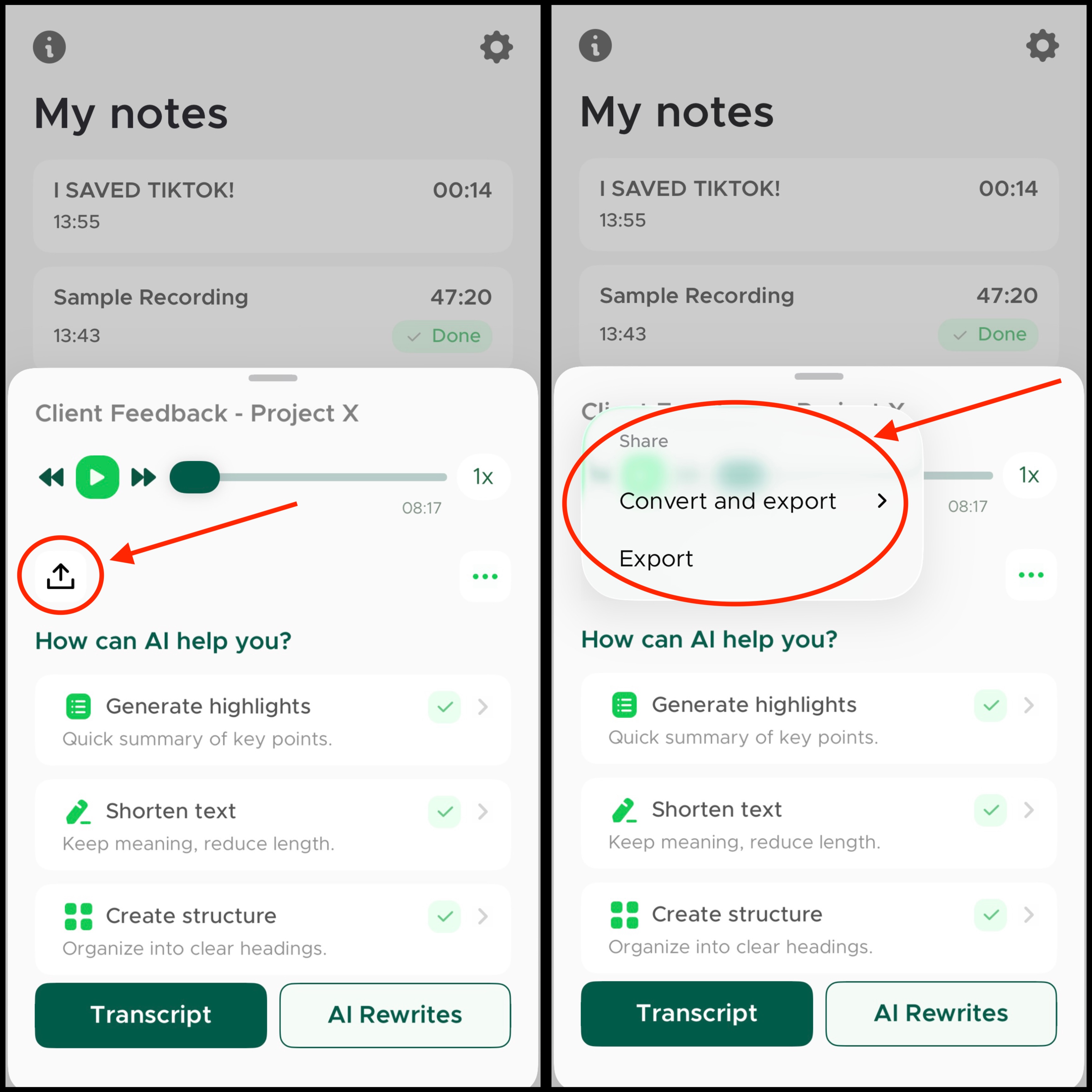 Instead of getting a full transcript, you can use AI Rewrites to instantly turn your note into rewritten text for a better structure. You can choose any AI Rewrite style depending on what you need.